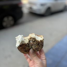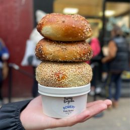 Worth the hype! For here around 9 on a Saturday. Yes there's a line out the door but also NY shops aren't huge so this is expected. They have a great process, someone is outside with bags, writing down your order on the bag. You hand the bag to the cashier and pay, and hands the bag to check crew. In and out in maybe 15 mins. The bagels were piping hot. The warm bagel dipped in the cold cream cheese 10/10 highly recommend. The salt bagel with scallion was my absolute fave. My son who loves everything sweet, loved the apple caramel, with chunks of apples!